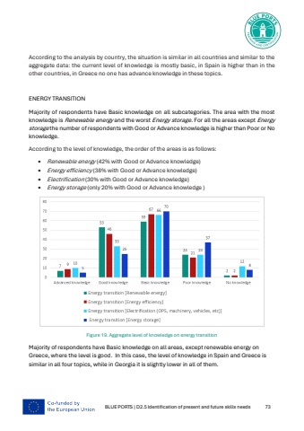 BLUE PORTS | D2.5 Identification of present and future skills needs 73According to the analysis by country, the situation is similar in all countries and similar to the aggregate data: the current level of knowledge is mostly basic, in Spain is higher than in the other countries, in Greece no one has advance knowledge in these topics.ENERGY TRANSITIONMajority of respondents have Basic knowledge on all subcategories. The area with the most knowledge is Renewable energy and the worst Energy storage. For all the areas except Energy storage the number of respondents with Good or Advance knowledge is higher than Poor or No knowledge.According to the level of knowledge, the order of the areas is as follows:%u2022 Renewable energy (42% with Good or Advance knowledge)%u2022 Energy efficiency (38% with Good or Advance knowledge)%u2022 Electrification (30% with Good or Advance knowledge)%u2022 Energy storage (only 20% with Good or Advance knowledge )Figure 19. Aggregate level of knowledge on energy transitionMajority of respondents have Basic knowledge on all areas, except renewable energy on Greece, where the level is good. In this case, the level of knowledge in Spain and Greece is similar in all four topics, while in Georgia it is slightly lower in all of them.
