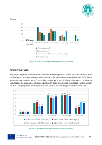 BLUE PORTS | D2.5 Identification of present and future skills needs 75GreeceFigure 22. Level of knowledge on energy transition in GreeceALTERNATIVE FUELSMajority of respondents have Basic and Poor knowledge on all areas. The area with the most knowledge is Hydrogen followed by Biofuels and the worst Ammonia and Methanol. For all the areas the respondents with Poor or No knowledge is much higher than Good or Advance knowledge. The proportion of respondents with Good or Advance knowledge varies between 17-25%. The proportion of respondents with Poor or No knowledge varies between 43-51.Figure 23. Aggregate level of knowledge on alternative fuels