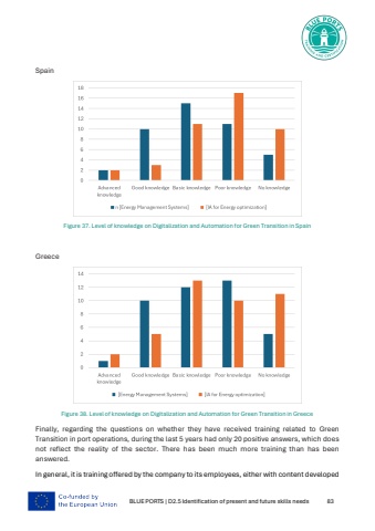 BLUE PORTS | D2.5 Identification of present and future skills needs 83SpainFigure 37. Level of knowledge on Digitalization and Automation for Green Transition in SpainGreeceFigure 38. Level of knowledge on Digitalization and Automation for Green Transition in GreeceFinally, regarding the questions on whether they have received training related to Green Transition in port operations, during the last 5 years had only 20 positive answers, which does not reflect the reality of the sector. There has been much more training than has been answered. In general, it is training offered by the company to its employees, either with content developed