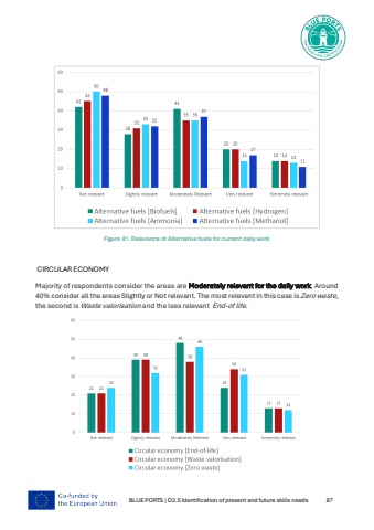 BLUE PORTS | D2.5 Identification of present and future skills needs 87Figure 41. Relevance of Alternative fuels for current daily workCIRCULAR ECONOMYMajority of respondents consider the areas are Moderately relevant for the daily work. Around 40% consider all the areas Slightly or Not relevant. The most relevant in this case is Zero waste, the second is Waste valorisation and the less relevant End-of life.