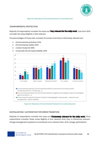 BLUE PORTS | D2.5 Identification of present and future skills needs 88Figure 42. Relevance of Circular Economy for current daily workENVIRONMENTAL PROTECTIONMajority of respondents consider the areas are Very relevant for the daily work. Less than 30% consider the areas Slightly or Not relevant.The percentages of those who consider the areas to be Very or Extremely relevant are:%u2022 Environmental pollution: 52%%u2022 Environmental safety: 55%%u2022 Carbon footprint: 46%%u2022 Corporate Social responsibility: 44%Figure 43. Relevance of Environmental Protection for current daily workDIGITALIZATION / AUTOMATION FOR GREEN TRANSITIONMajority of respondents consider the areas are Moderately relevant for the daily work. More respondents consider these areas Slightly or Not relevant than Very or Extremely relevant. Energy management systems is considered more relevant than AI for energy optimization.