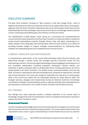BLUE PORTS | D2.5 Identification of present and future skills needs 9EXECUTIVE SUMMARYThe Blue Ports initiative, focusing on \significantly enhance the skills and capacities of the human capital within the port ecosystem, aligning it with the Green Transition imperatives laid out by the European Green Deal and the Sustainable Blue Economy Strategy. As ports across Europe are increasingly viewed as pivotal nodes in achieving sustainability goals, this initiative is timely and critical. The \current and future skills required to drive the Green Transition in small and medium-sized ports across several participating countries: Georgia, Greece, Italy, and Spain, presenting an indepth analysis of the skills gaps and training needs within the port industry up to 2030 and providing valuable insights to support strategic recommendations for addressing these needsfor the sustainable growth and competitiveness of the port sector.CURRENT LANDSCAPE AND METHODOLOGYA comprehensive examination of the current skills landscape within the port industry, was determined through a market survey and foresight exercise conducted across the four participating countries. The dual-pronged methodology involved engaging a broad spectrum of port ecosystem stakeholders, including employers, employees, industry experts, and academia, to gather qualitative data on existing skill levels, training experiences, and future needs related to the Green Transition. The market survey, conducted between June and July 2024, focused on capturing the educational backgrounds, professional experiences, and skill sets of port personnel. The survey also sought to understand the relevance of various green skills in the current job market and the anticipated demand for these skills by 2030. The foresight exercise, designed and implemented during the National Technical Committees consultation meetings in all participating countries, explored potential future developments in port operations, particularly in the context of Green Transition and the Blue Economy.KEY FINDINGSKey findings from these exercises provide a detailed synthesis of the current state of knowledge, the gaps that need to be addressed, and the competencies that will be required to support the Green Transition in ports:Environmental Protection Current Training and Knowledge Levels: Environmental protection emerged as one of the areas where port personnel have a relatively strong foundation. The survey results indicate that many respondents have a basic to good understanding of environmental issues such as pollution