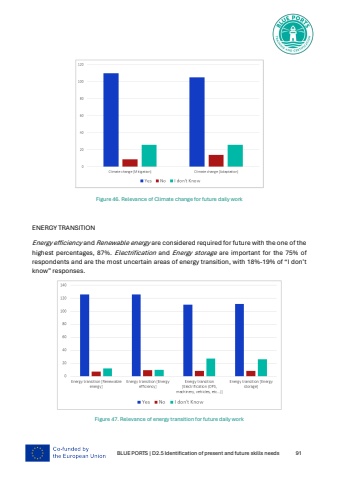 BLUE PORTS | D2.5 Identification of present and future skills needs 91Figure 46. Relevance of Climate change for future daily workENERGY TRANSITIONEnergy efficiency and Renewable energy are considered required for future with the one of the highest percentages, 87%. Electrification and Energy storage are important for the 75% of respondents and are the most uncertain areas of energy transition, with 18%-19% of %u201cI don%u2019t know%u201d responses.Figure 47. Relevance of energy transition for future daily work