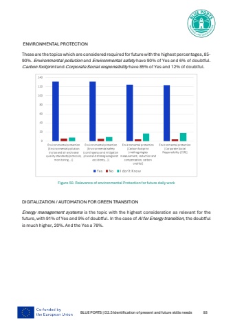 BLUE PORTS | D2.5 Identification of present and future skills needs 93ENVIRONMENTAL PROTECTIONThese are the topics which are considered required for future with the highest percentages, 85-90%. Environmental pollution and Environmental safety have 90% of Yes and 6% of doubtful. Carbon footprint and Corporate Social responsibility have 85% of Yes and 12% of doubtful.Figure 50. Relevance of environmental Protection for future daily workDIGITALIZATION / AUTOMATION FOR GREEN TRANSITIONEnergy management systems is the topic with the highest consideration as relevant for the future, with 91% of Yes and 9% of doubtful. In the case of AI for Energy transition, the doubtful is much higher, 20%. And the Yes a 78%.