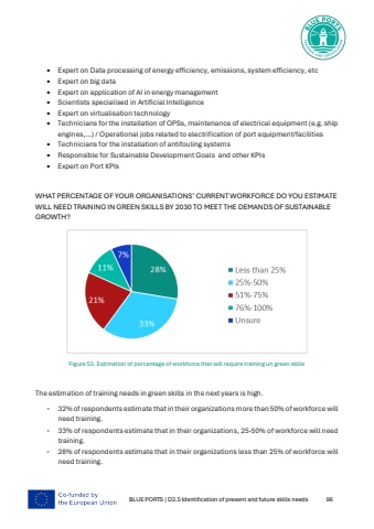 BLUE PORTS | D2.5 Identification of present and future skills needs 96%u2022 Expert on Data processing of energy efficiency, emissions, system efficiency, etc%u2022 Expert on big data%u2022 Expert on application of AI in energy management%u2022 Scientists specialised in Artificial Intelligence%u2022 Expert on virtualisation technology%u2022 Technicians for the installation of OPSs, maintenance of electrical equipment (e.g. ship engines,...) / Operational jobs related to electrification of port equipment/facilities%u2022 Technicians for the installation of antifouling systems%u2022 Responsible for Sustainable Development Goals and other KPIs %u2022 Expert on Port KPIsWHAT PERCENTAGE OF YOUR ORGANISATIONS%u2019 CURRENT WORKFORCE DO YOU ESTIMATE WILL NEED TRAINING IN GREEN SKILLS BY 2030 TO MEET THE DEMANDS OF SUSTAINABLE GROWTH?Figure 53. Estimation of percentage of workforce that will require training un green skillsThe estimation of training needs in green skills in the next years is high.%uf0a7 32% of respondents estimate that in their organizations more than 50% of workforce will need training.%uf0a7 33% of respondents estimate that in their organizations, 25-50% of workforce will need training.%uf0a7 28% of respondents estimate that in their organizations less than 25% of workforce will need training.