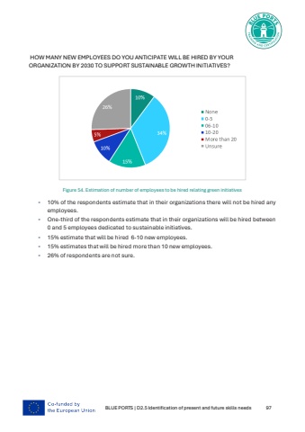 BLUE PORTS | D2.5 Identification of present and future skills needs 97HOW MANY NEW EMPLOYEES DO YOU ANTICIPATE WILL BE HIRED BY YOUR ORGANIZATION BY 2030 TO SUPPORT SUSTAINABLE GROWTH INITIATIVES?Figure 54. Estimation of number of employees to be hired relating green initiatives%uf0a7 10% of the respondents estimate that in their organizations there will not be hired any employees.%uf0a7 One-third of the respondents estimate that in their organizations will be hired between 0 and 5 employees dedicated to sustainable initiatives.%uf0a7 15% estimate that will be hired 6-10 new employees.%uf0a7 15% estimates that will be hired more than 10 new employees.%uf0a7 26% of respondents are not sure.