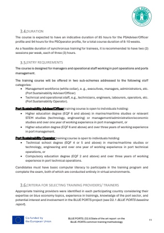 BLUE PORTS | D2.6 State of the art report on the BLUE-PORTS common training methodology 11DURATIONThe course is expected to have an indicative duration of 85 hours for the PSAdviser/Officerprofile and 94 hours for the PSOperator profile, for a total course duration of 8-10 weeks.As a feasible duration of synchronous training for trainees, it is recommended to have two (2) sessions per week, each of three (3) hours.ENTRY REQUIREMENTSThe course is designed for managers and operational staff working in port operations and ports management.The training course will be offered in two sub-schemes addressed to the following staff categories: %u2022 Management workforce (white collar), e. g., executives, managers, administrators, etc.(Port Sustainability Adviser/Officer)%u2022 Technical and operational staff, e.g., technicians, engineers, labourers, operators, etc.(Port Sustainability Operator).Port Sustainability Adviser/Officer training course is open to individuals holding: %u2022 Higher education degree (EQF 6 and above) in marine/maritime studies or relevant STEM studies (technology, engineering) or management/administration/economic studies and over one year of working experience in port management, or%u2022 Higher education degree (EQF 6 and above) and over three years of working experience in port management.Port Sustainability Operator training course is open to individuals holding: %u2022 Technical school degree (EQF 4 or 5 and above) in marine/maritime studies or technology, engineering and over one year of working experience in port technical operations, or%u2022 Compulsory education degree (EQF 2 and above) and over three years of working experience in port technical operations.Candidates must have basic computer literacy to participate in the training program and complete the exam, both of which are conducted entirely in virtual environments. CRITERIA FOR SELECTING TRAINING PROVIDERS/ TRAINERSAppropriate training providers were identified in each participating country considering their expertise on blue economy topics, experience in trainings, knowledge of the port sector, and potential interest and involvement in the BLUE PORTS project (see D2.1 BLUE PORTS baseline report).