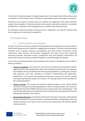 BLUE PORTS | D2.6 State of the art report on the BLUE-PORTS common training methodology 12Trainers will be selected based on tangible experience in the subject field, either professional or academic, and recruited in, but not limited to, organisations part of the project consortium.Preference will be given to trainers who are certified and registered in the adult education teacher trainer registers. Particular attention will be paid to basing this selection on standard qualifications, working and teaching experience in maritime and ports personnel.An orientation session/workshop covering structure, objectives, and specific content areas will be organized to help trainers' preparation.TRAINING TOOLS3.7.1. TRAINING MATERIALS AND RESOURCESIn order to roll out the courses, a variety of training materials and resources are used to ensure that the learning experience is effective, engaging and accessible. This may include text-based contents such as guides, manuals, presentations and other written documents, virtual classrooms, video lectures and tutorials, infographics and other visual aids, interactive eLearning modules, discussion forums, assessment tools and feedback mechanisms. All material and resources will be provided through the Learning Management System.In any case, the training materials will be detailed in the Trainees%u2019 Handbook and the Trainers%u2019 Manual as follows:%u2022 Trainees%u2019 Handbook: This document will cover the technical and theoretical content, aligned with the learning objectives, skills, and competencies presented in the syllabus. The handbook will be complemented with practical guidelines, including tips, step-bystep guidance, and case examples to facilitate understanding and application. Additionally, it will include self-assessment exercises, resources for further reading, ensuring comprehensive support for trainees. The training material will be available on the e-learning platform.%u2022 Trainers%u2019 Manual: This manual will provide a detailed analysis of the e-BLUE PORTS curriculum, along with practical guidelines to assist training providers and trainers in aligning with the BLUE PORTS training scheme requirements and methodology. It will also include instructions on the effective use of training tools, ensuring a structured and standardized delivery of the courses.%u2022 Exercise Book Solutions: A dedicated section with solutions to exercises, allowing both trainees and trainers to verify responses, understand problem-solving approaches, and reinforce learning. This resource will enhance self-assessment and facilitate guided training sessions.
