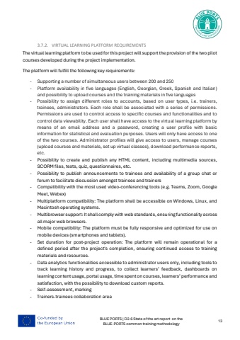 BLUE PORTS | D2.6 State of the art report on the BLUE-PORTS common training methodology 133.7.2. VIRTUAL LEARNING PLATFORM REQUIREMENTSThe virtual learning platform to be used for this project will support the provision of the two pilot courses developed during the project implementation.The platform will fulfill the following key requirements:- Supporting a number of simultaneous users between 200 and 250- Platform availability in five languages (English, Georgian, Greek, Spanish and Italian)and possibility to upload courses and the training materials in five languages- Possibility to assign different roles to accounts, based on user types, i.e. trainers, trainees, administrators. Each role shall be associated with a series of permissions. Permissions are used to control access to specific courses and functionalities and to control data viewability. Each user shall have access to the virtual learning platform by means of an email address and a password, creating a user profile with basic information for statistical and evaluation purposes. Users will only have access to one of the two courses. Administrator profiles will give access to users, manage courses (upload courses and materials, set up virtual classes), download performance reports, etc.- Possibility to create and publish any HTML content, including multimedia sources, SCORM files, tests, quiz, questionnaires, etc.- Possibility to publish announcements to trainees and availability of a group chat or forum to facilitate discussion amongst trainees and trainers- Compatibility with the most used video-conferencing tools (e.g. Teams, Zoom, Google Meet, Webex)- Multiplatform compatibility: The platform shall be accessible on Windows, Linux, and Macintosh operating systems.- Multibrowser support: It shall comply with web standards, ensuring functionality across all major web browsers.- Mobile compatibility: The platform must be fully responsive and optimized for use on mobile devices (smartphones and tablets).- Set duration for post-project operation: The platform will remain operational for a defined period after the project's completion, ensuring continued access to training materials and resources.- Data analytics functionalities accessible to administrator users only, including tools to track learning history and progress, to collect learners%u2019 feedback, dashboards on learning content usage, portal usage, time spent on courses, learners%u2019 performance and satisfaction, with the possibility to download custom reports.- Self-assessment, marking- Trainers-trainees collaboration area