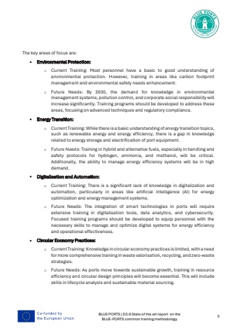 BLUE PORTS | D2.6 State of the art report on the BLUE-PORTS common training methodology 5The key areas of focus are:%u2022 Environmental Protection: o Current Training: Most personnel have a basic to good understanding of environmental protection. However, training in areas like carbon footprint management and environmental safety needs enhancement.o Future Needs: By 2030, the demand for knowledge in environmental management systems, pollution control, and corporate social responsibility will increase significantly. Training programs should be developed to address these areas, focusing on advanced techniques and regulatory compliance.%u2022 Energy Transition: o Current Training: While there is a basic understanding of energy transition topics, such as renewable energy and energy efficiency, there is a gap in knowledge related to energy storage and electrification of port equipment.o Future Needs: Training in hybrid and alternative fuels, especially in handling and safety protocols for hydrogen, ammonia, and methanol, will be critical. Additionally, the ability to manage energy efficiency systems will be in high demand.%u2022 Digitalisation and Automation: o Current Training: There is a significant lack of knowledge in digitalization and automation, particularly in areas like artificial intelligence (AI) for energy optimization and energy management systems.o Future Needs: The integration of smart technologies in ports will require extensive training in digitalisation tools, data analytics, and cybersecurity. Focused training programs should be developed to equip personnel with the necessary skills to manage and optimize digital systems for energy efficiency and operational effectiveness.%u2022 Circular Economy Practices: o Current Training: Knowledge in circular economy practices is limited, with a need for more comprehensive training in waste valorisation, recycling, and zero-waste strategies.o Future Needs: As ports move towards sustainable growth, training in resource efficiency and circular design principles will become essential. This will include skills in lifecycle analysis and sustainable material sourcing.