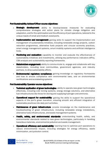 BLUE PORTS | D2.6 State of the art report on the BLUE-PORTS common training methodology 7 Port Sustainability Adviser/Officer course objectives: %u2022 Strategic development: ability to develop/assess measures for evaluating comprehensive strategies and action plans for climate change mitigation and adaptation, and for the optimisation and the efficiency of port operations, tailored to the unique needs of small and medium-sized ports.%u2022 Implementation and management: gaining skills to support the implementation and management of sustainability initiatives, including renewable energy projects, carbon reduction programmes, alternative fuels projects and circular economy practices, smart energy management systems, smart mobility systems and artificial intelligence tools.%u2022 Monitoring and evaluation: capability to monitor and evaluate the effectiveness of sustainability initiatives and investments, utilising key performance indicators (KPIs), CBA analysis and sustainability reporting frameworks.%u2022 Stakeholders engagement: ability to communicate to, engage and collaborate with key stakeholders, including local communities, government agencies, and industry partners, to drive sustainability efforts.%u2022 Environmental regulatory compliance: gaining knowledge on regulatory frameworks and how to ensure compliance with environmental laws, and on environmental certifications and ecolabelling systems.Port Sustainability Operator course objectives: %u2022 Technical application of green technologies: ability to operate new green technologies effectively, including cold ironing systems, energy storage solutions, and alternative fuel infrastructures like those for storing and supplying hydrogen and ammonia.%u2022 Operational support for sustainability: gaining the skills to support the operational aspects of the port's green transition, ensuring smooth and efficient integration of sustainable practices into daily port activities.%u2022 Maintenance of green infrastructure: provide knowledge on the maintenance and troubleshooting of green infrastructure, including renewable energy installations, alternative fuels infrastructures, and waste management systems.%u2022 Health, safety, and environmental standards: understanding health, safety, and environmental standards related to new green technologies, particularly in handling hazardous materials, environmental pollution and waste management.%u2022 Operational efficiency and sustainability: learning how to optimize port operations to reduce environmental impact, including strategies for energy efficiency, waste minimization, and pollution control.